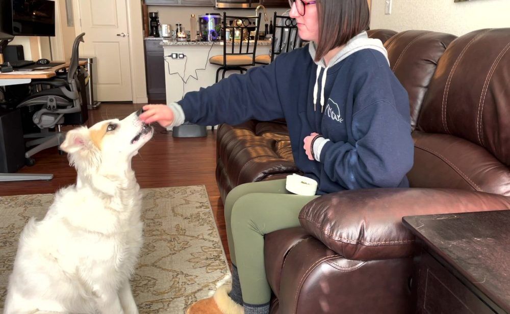 Once Sarah has established this initial pattern, instead of clicking when Wrigley lowers her head, she clicks when Wrigley brings her head back up. Wrigley lowers her head, brings it back up, and then Sarah clicks and delivers the treat. In no time, Wrigley is fully (and enthusiastically) nodding her head! Sarah can now put this behavior on a verbal cue. She can even teach Wrigley to offer a head nod after she asks a question. “Do you like learning fun new behaviors?” “YES” (via a head nod)!